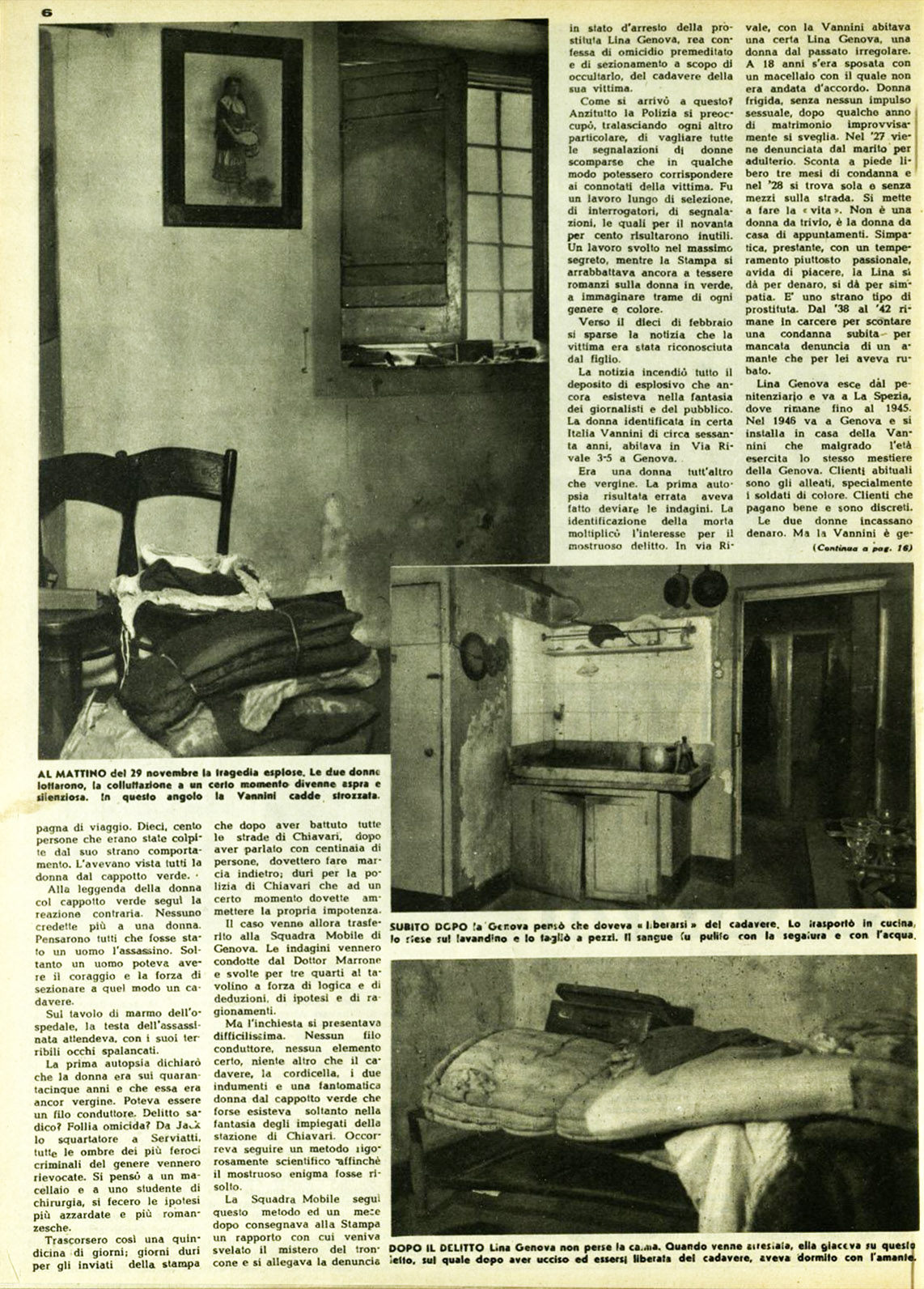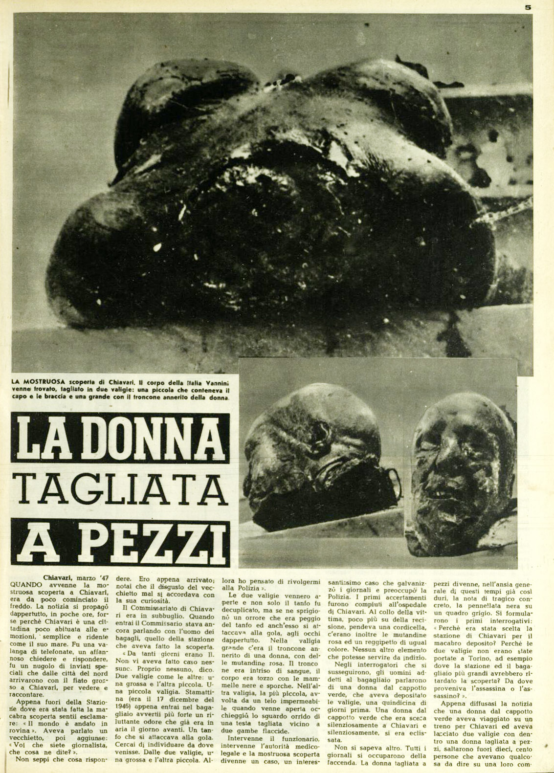 - Il 22 novembre 1945 Celeste Genova, inquilina in una stanza in via Rivale a Genova uccide, strangolandola con un laccio, la proprietaria di casa, Italia Vannini. Poi la taglia a pezzi e nasconde i resti in due valigie che abbandona al deposito bagagli di Chiavari, dove vengono aperte il 18 dicembre. Le due donne avrebbero esercitato insieme, in quella casa, la prostituzione, ma i loro rapporti si sarebbero incrinati e Vannini avrebbe intimato a Genova di andarsene provocando la lite sfociata nel delitto. Oltre all’omicidio e all’occultamento di cadavere, Genova è accusata anche del furto di diversi oggetti della vittima.