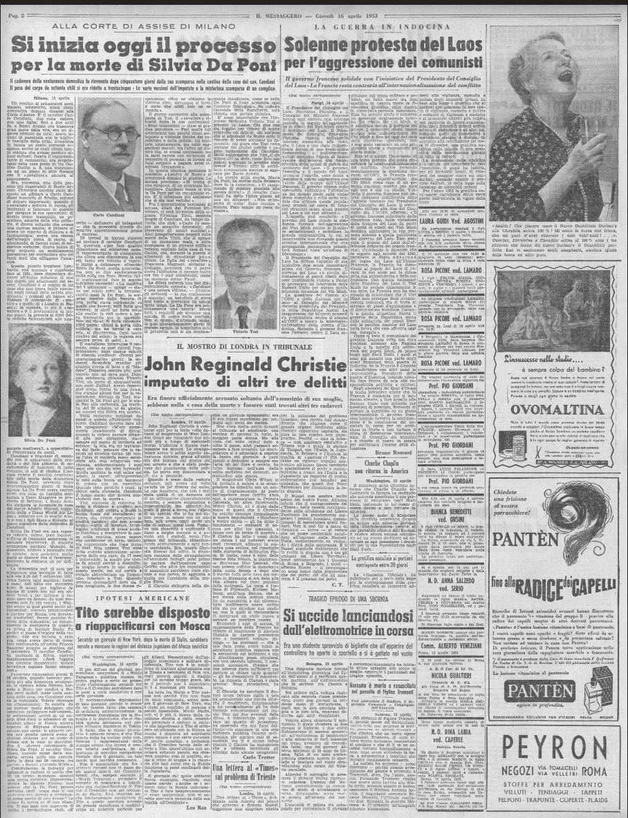 - Il 16 aprile 1953 inizia il processo per la morte di Silvia Da Pont contro Carlo Candiani accusato di «omicidio con le aggravanti della crudeltà e del fine abietto, di occultamento di cadavere, di ratto violento, di atti di libidine» (Il Messaggero di Roma, 16-4-1953)