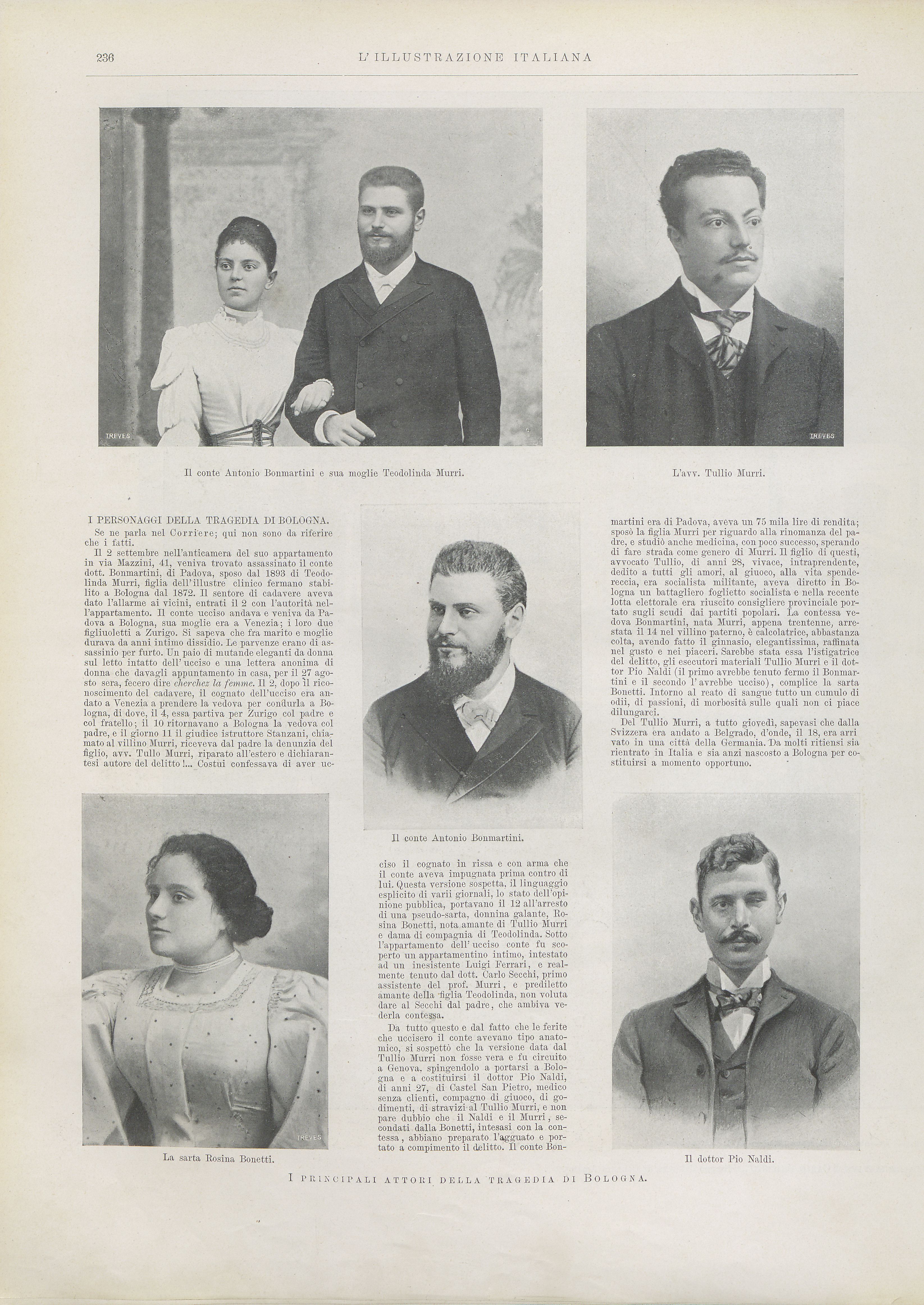 - La sera del 28 agosto 1902 il conte Francesco Bonmartini viene ucciso nella sua casa in via Mazzini, nel centro di Bologna, colpito ripetutamente da feroci coltellate. È solo, la moglie soggiorna con i figli a Venezia, e inizialmente si ipotizza “un agguato con l'esca dell'avventura galante”. Rapidamente però le indagini si concentrano sul cognato, Tullio Murri, che avrebbe agito per liberare la sorella da un matrimonio infelice, avvalendosi della complicità di un amico medico, Pio Naldi, della propria amante, Rosina Bonetti, guardarobiera di Linda Murri, e dell’amante di Linda Murri stessa, Carlo Secchi, precettore della donna che avrebbe voluto sposarla se la famiglia non si fosse opposta. Istigatrice dell'omicidio sarebbe stata proprio Linda Murri, che avrebbe più volte in passato tentato di avvelenare il marito senza riuscirci. Sotto accusa è però soprattutto la figura del pater familiae, Augusto Murri, stimato medico e docente dell’università di Bologna, conosciuto per le sue idee progressiste, in cui i cattolici non esitano ad additare la causa della degenerazione morale dell’intera famiglia. “Il delitto di Bologna avrebbe messo sotto gli occhi di tutti che l'educazione laica e positiva, additata dagli scienziati e intellettuali positivisti dell'Italia di fine secolo come il mezzo per arginare il fenomeno della degenerazione fisica e morale della nazione, produce tutt'altro: immoralità e delinquenza”, (Babini, p. 10). Non solo, i giornali non si limitano ad indicare nello spirito laico e razionalista di Murri le cause della mancanza di senso morale della famiglia, ma costruiscono tutta una serie di indiscrezioni che dipingono la vita dei Murri come segnata dalla licenziosità e da relazioni incestuose. Nelle settimane successive al delitto al momento dell'arresto dei sospettati e poi nelle diverse fasi dei dibattimenti processuali i giornali in particolare L'Avvenire e il Resto del Carlino (giornale anticlericale e filo socialista) seguono i fatti, dando conto delle ricostruzioni degli inquirenti e svolgendo proprie indagini, in una corsa alla notizia che soddisfa la curiosità popolare, ma che diventa appunto presto il centro anche di un’accesa querelle politico-ideologica tra cattolici e progressisti. Va tenuto fra l'altro presente che in quegli anni si sta discutendo di divorzio con un progetto presentato in Parlamento dagli avvocati Agostino Berenini e Alberto Borciani. Il delitto smentirebbe la tesi dei socialisti come Napoleone Colaianni che vedono nel delitto l'espressione principalmente della miseria, una conseguenza di condizioni di vita difficili. E a sostenere una posizione critica nei confronti di Augusto Murri, parlando di un delitto dell'educazione, non sono solo i giornali ma i giudici stessi e il pubblico ministero. “A partire da metà settembre L'Avvenire si attiva: da un lato, inizia a pubblicare resoconti sempre più ricchi di informazioni, dall'altro prende spunto dal caso per avanzare riflessioni e insinuazioni… gli articoli si dotano di paragrafi con titoli accattivanti che scandiscono l'incalzare delle notizie; la comunicazione si fa più immediata e partecipata, e non rinuncia all'effetto suspense. È una vera e propria corsa a guadagnarsi la palma del giornale più informato sul delitto. E così è: nella prima metà di settembre il quotidiano cattolico si impone come la fonte principale di informazione per tutti gli altri giornali, che, ormai attratti dal caso, non riescono a rinunciare agli scoop e ai colpi di scena. … All'inizio del 1903, quando la vicenda avrà assunto i toni della sfida politica… riuscirà persino ad abbassare il prezzo”. Del resto “in occasione del caso i giornali giungono a toccare addirittura le tre edizioni giornaliere”. Il caso ha una risonanza nazionale e internazionale enorme, non solo è seguito costantemente dalla stampa, ma vede la pubblicazione di numerosi libri – memorie, ricostruzioni giudiziarie, trascrizione delle perizie- e la presa di posizione di diversi esponenti del mondo intellettuale a sostegno dei Murri. È lo specchio di una società italiana in trasformazione con il conte Bonmartini esponente della vecchia aristocrazia e dei suoi valori, e la famiglia Murri espressione di una nuova borghesia progressista che però non riesce a svincolarsi del tutto dal perbenismo e dai simboli di status del passato. In particolare, poi, nella figura di Linda Murri, dipinta a tinte fosche dal misoginismo della stampa del tempo, può essere vista un nuovo paradigma di donna che inizia ad essere insofferente verso condizione sociale in cui è confinata. “Il processo non ripropone solo temi e problematiche importanti per l'esercizio della giustizia, ma chiama in causa tutta un'epoca con i suoi valori: la scienza, la religione, la famiglia, i rapporti tra i due sessi, la maternità”, (Babini, p. 141). Il processo spostato da Bologna a Torino per legittima suspicione, si apre il 21 febbraio 1905, con un’affluenza di giornalisti della stampa nazionale e internazionale, tale da richiedere anche la costruzione di una tribuna specialee con il conseguente restringimento del gabbione degli imputati. Tra gli avvocati della difesa spicca il nome di Enrico Ferri, esponente socialista e direttore dell'Avanti. Mentre per la pubblica accusa troviamo Scipio Sighele che, sotto lo pseudonimo di Historicus, scriverà sull'Illustrazione italiana diversi articoli sul processo, alcuni di ferma condanna della figura di Linda Murri. A dirigere il dibattimento è Ettore Dusio, accanto a lui figurano i giudici Antonio Cantarella e Remigio Della Chiesa D’Isasca; pubblico ministero è Gian Luigi Colli”. “La sentenza viene pronunciata l'undici agosto 1905. Tullio Murri e Pio Naldi sono dichiarati all'unanimità colpevoli di assassinio con l'aggravante della premeditazione; …Per Carlo Secchi e Teodolinda Murri, colpevoli di complicità non necessaria nel delitto ma non di premeditazione, i giurati si sono